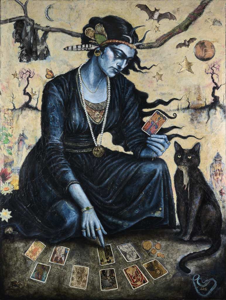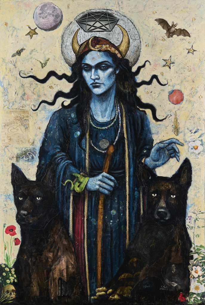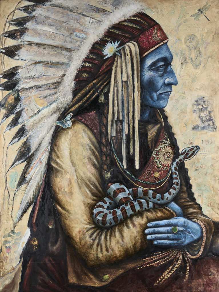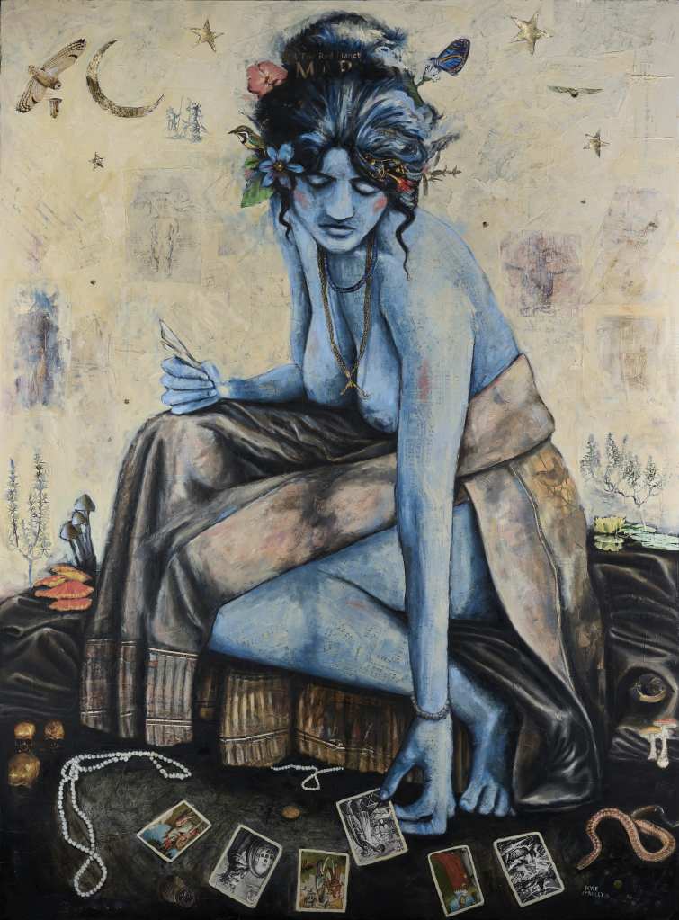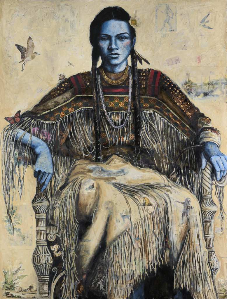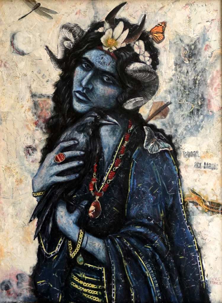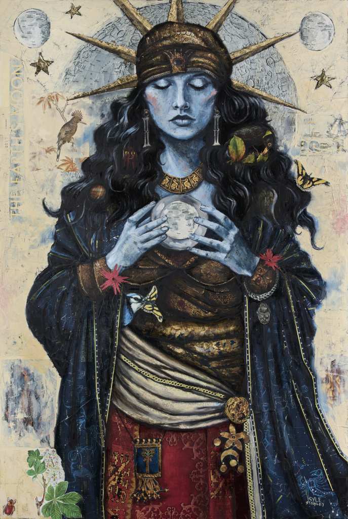 Built from layers of antique maps, postcards, and printed ephemera, Kyle’s compositions feel archival and immersive. Spectral figures are a recurring presence, emerging from textured surfaces as symbols of memory, folklore, and fable. These figures often inhabit spaces where personal narrative and collective history overlap, drawing from world cultures, myth, and quiet human moments.