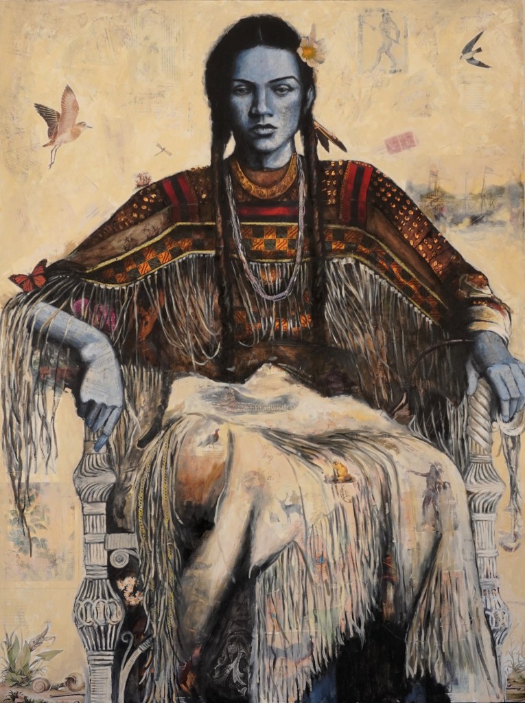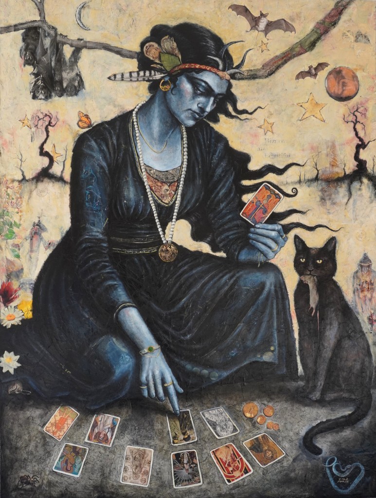 All pieces are original one of a kind works. Created by first collaging antique ephemera such as, National Geographic magazines, postcards, letters, maps and sheet music. The piece is then topped with oil paint using a glazing technique. Slowly adding layer after layer, allowing the imagery and textures to show through. Mysticism, folklore and rich history are the themes that run throughout this collection. Each piece is meant to be a snapshot of a larger narrative.