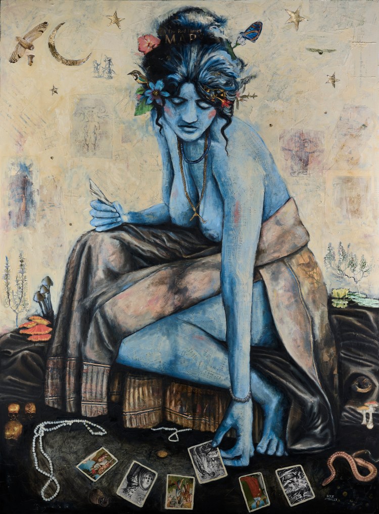 All pieces are original one of a kind works by Kyle Stanley. Each was created by first collaging antique ephemera, such as National Geographic magazines, postcards, letters, and sheet music, onto a wood surface. Oil paint is then applied using a glazing technique, allowing the underlying imagery and textures to remain visible. Mysticism, folklore and rich history are the themes that run throughout this collection. Each piece is meant to be a snapshot of a larger narrative.