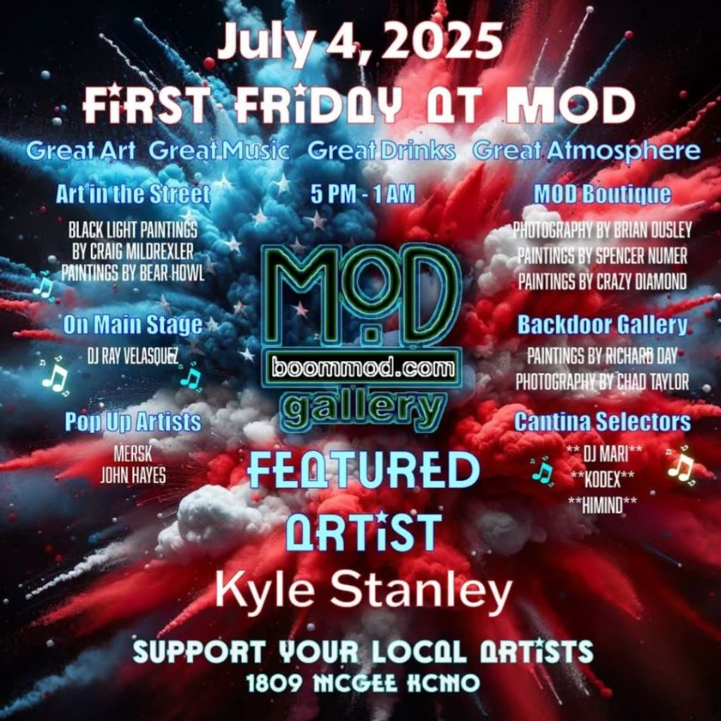 This Friday, 4th of July, come hang with us at MOD Gallery in the Kansas City Crossroads for First Fridays! There will be a DJ, two bars, food trucks and more. The Crossroads will be filled with live music, artist tents and more. Come celebrate the 4th of July at MOD Gallery!