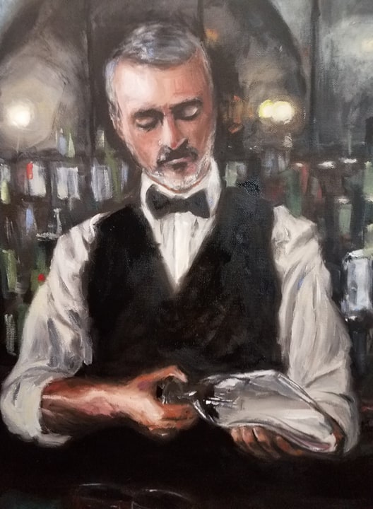 This piece was created by collaging antique postcards, maps and other ephemera. I then apply oil paint on top of the items.
