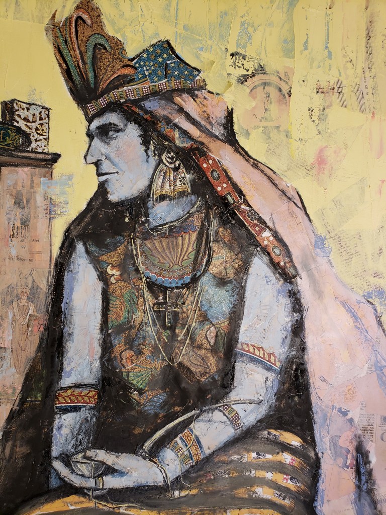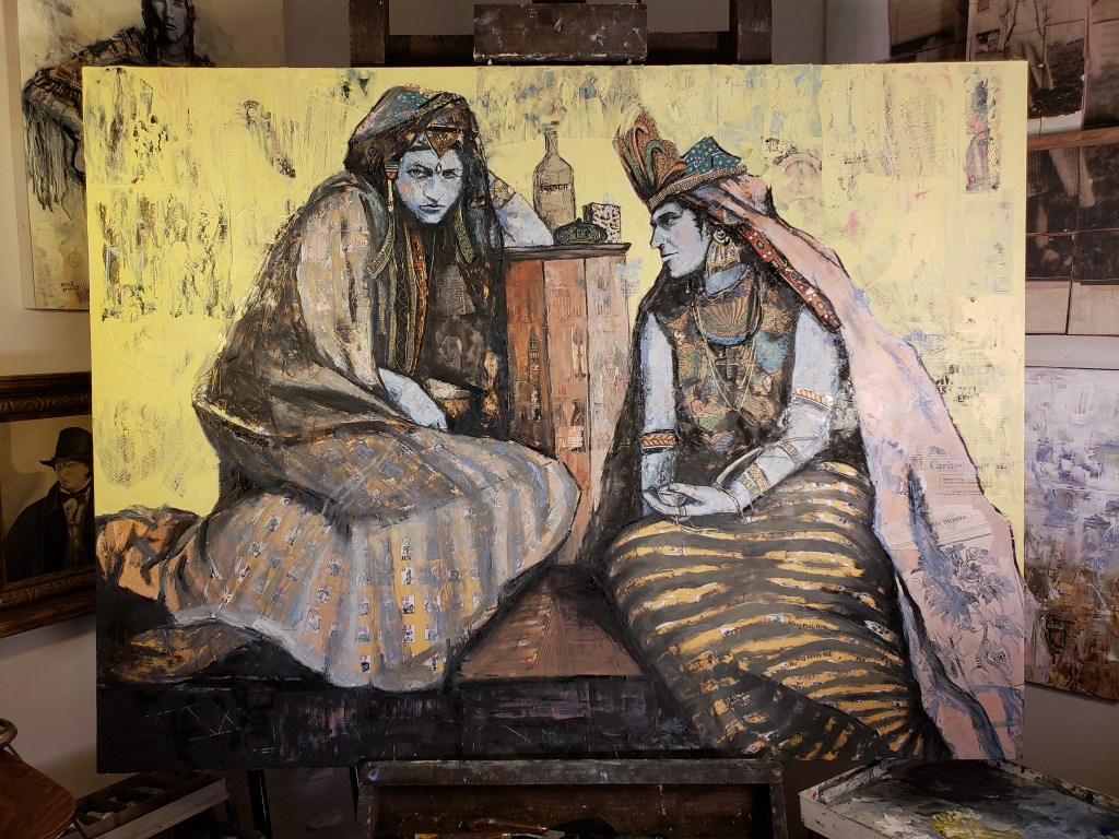 I started this piece early last week. It is a large 48 x 36″ canvas. I began by sketching the figures directly onto the canvas with vine charcoal. Once I achieve a general composition I am happy with, I start collaging items onto the canvas or wood panel. Most of the items used in the collage are late 1800 early 1900 postcards, maps, and magazine cutouts. They are applied to the surface with an acrylic gel medium (matte) Once the surface is covered with the collaged pieces and dried, I work over it with oil paint, adding color and detail.