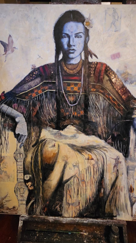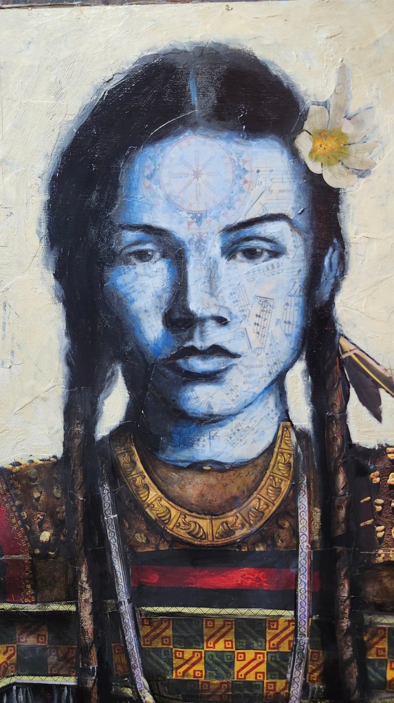 This piece was created by first collaging antique ephemera, such as National Geographic magazines, postcards, letters, and sheet music and gold leaf onto a wood surface. Oil paint is then applied using a glazing technique, allowing the underlying imagery and textures to remain visible.