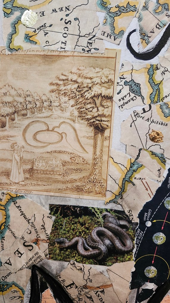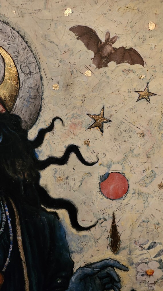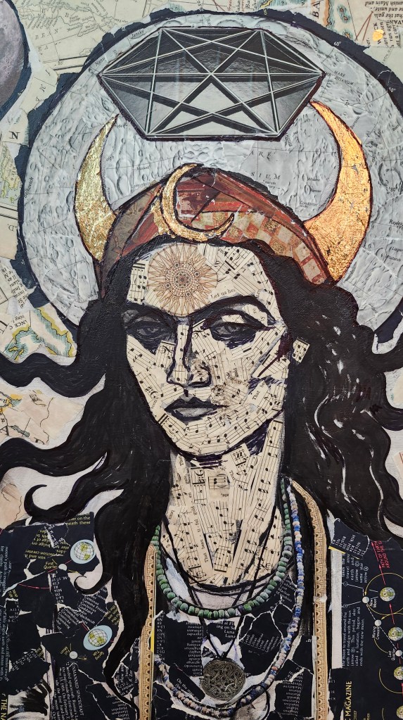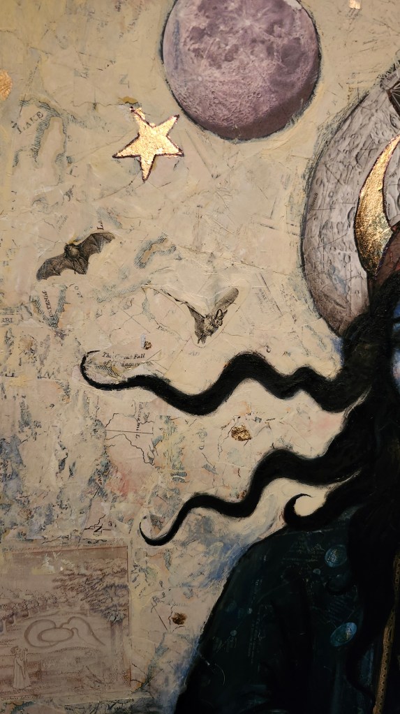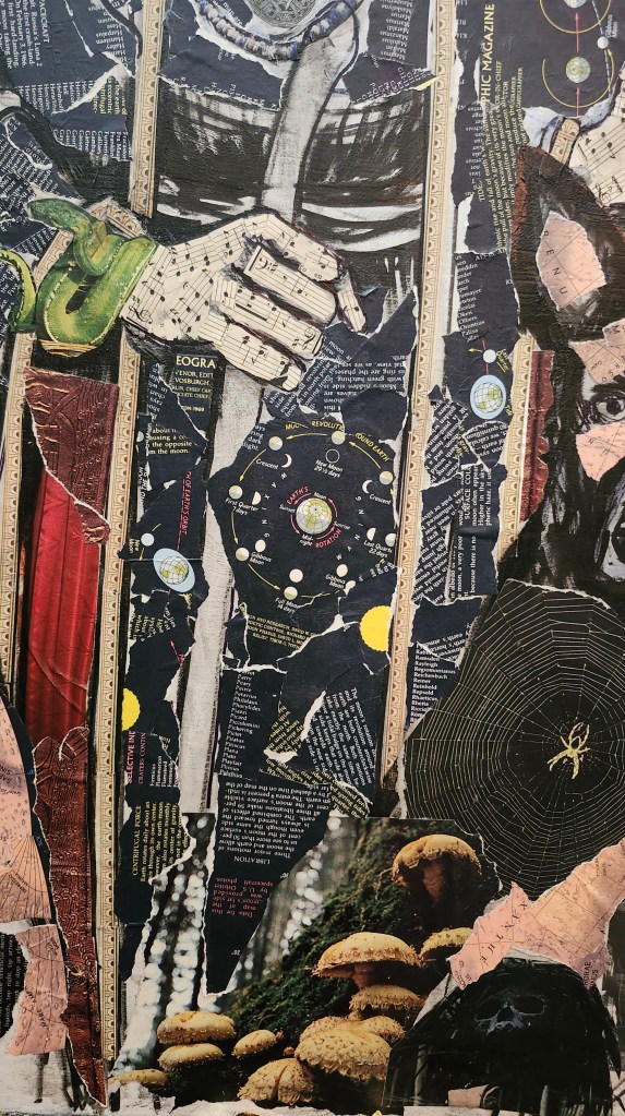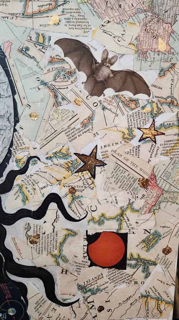 This piece was created by first collaging antique ephemera, such as National Geographic magazines, postcards, letters, and sheet music and gold leaf onto a wood surface. Oil paint is then applied using a glazing technique, allowing the underlying imagery and textures to remain visible.