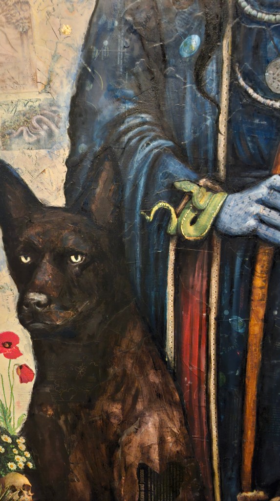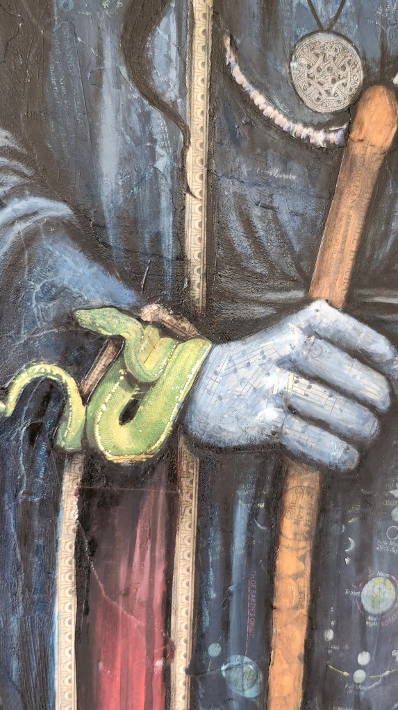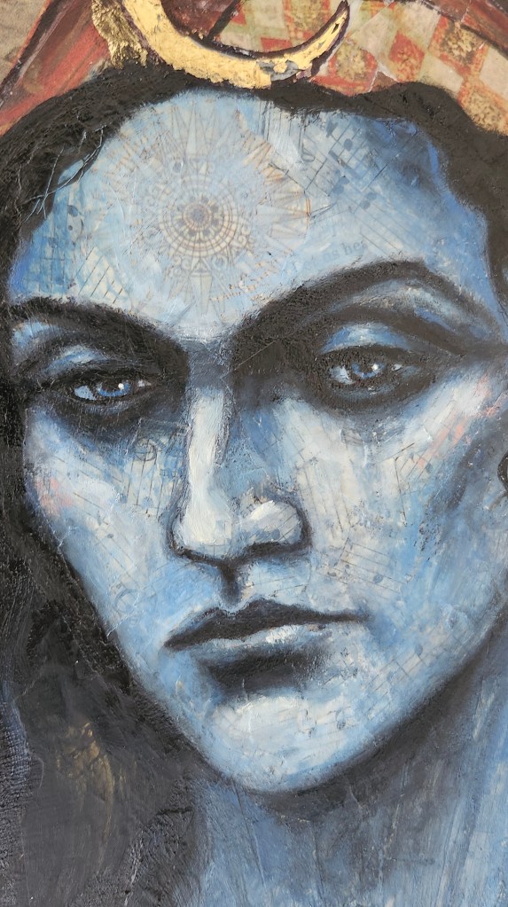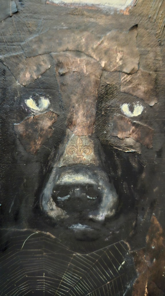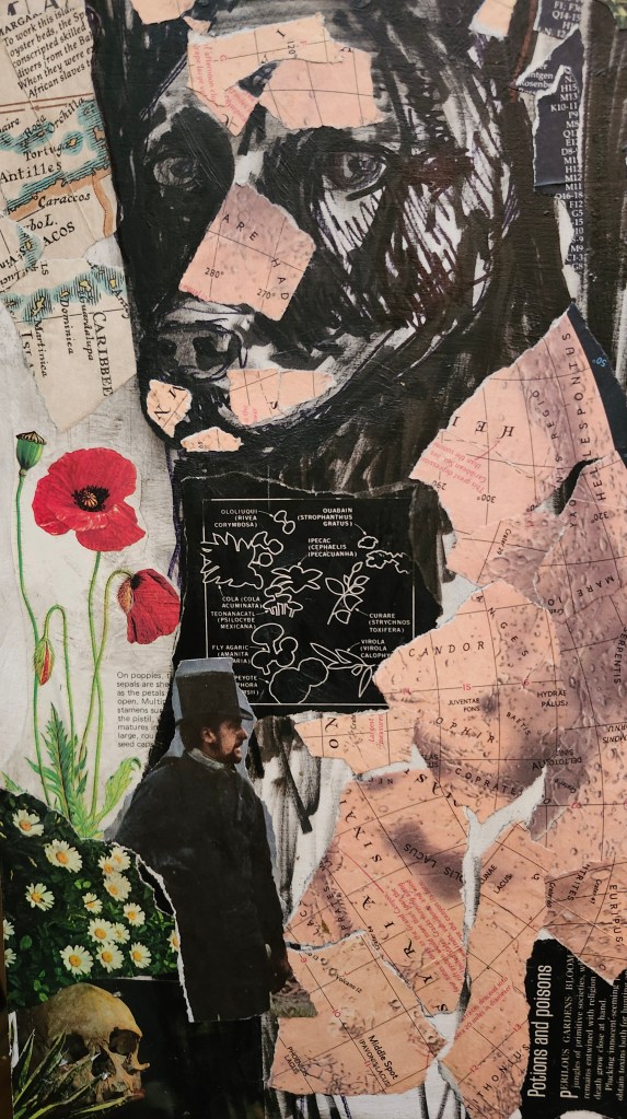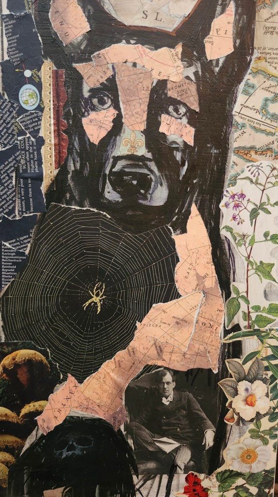 This piece was created by first collaging antique ephemera, such as National Geographic magazines, postcards, letters, and sheet music and gold leaf onto a wood surface. Oil paint is then applied using a glazing technique, allowing the underlying imagery and textures to remain visible.