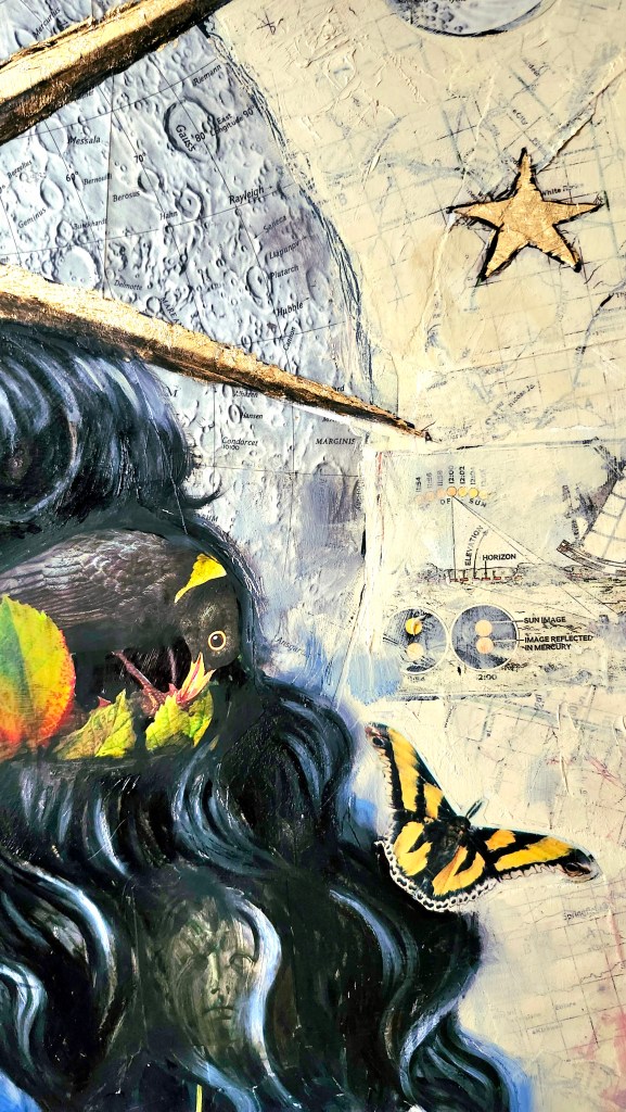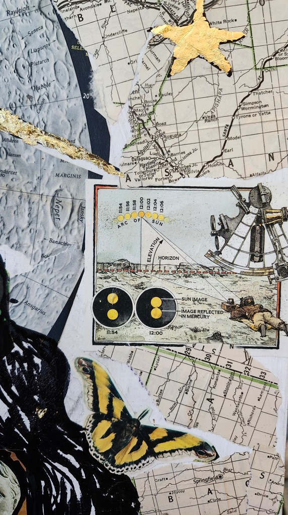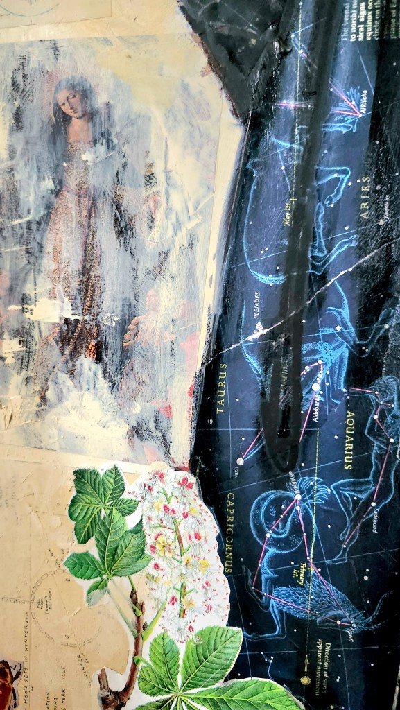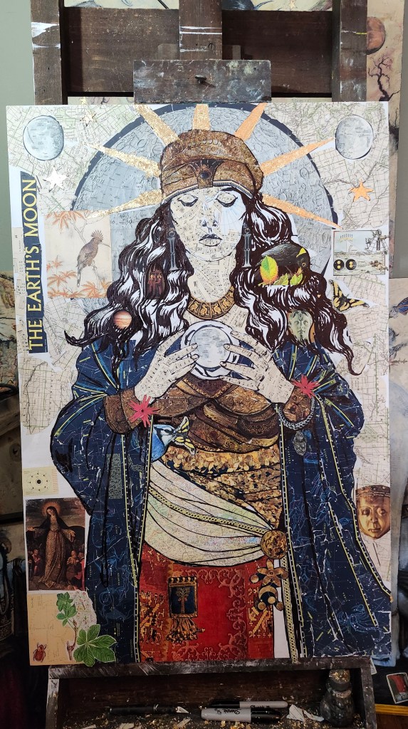 This piece was created by first collaging antique ephemera, such as National Geographic magazines, postcards, letters, and sheet music and gold leaf onto a wood surface. Oil paint is then applied using a glazing technique, allowing the underlying imagery and textures to remain visible.