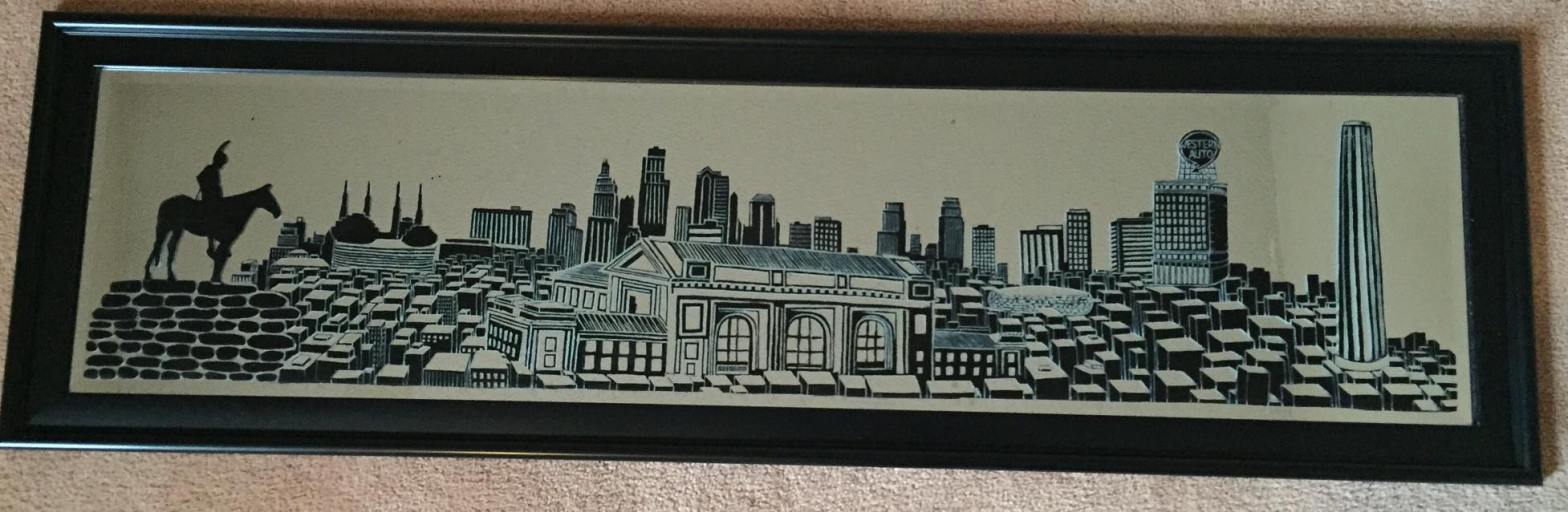 A custom pair of “Kansas City” shoes as well as a “Mirror Painting” I created. The mirror was a full-length mirror, covered and India Ink and etched away the skyline design.